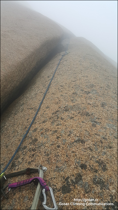 3피치 등반 시작과 함께 한방울씩 떨어지던 빗방울이 세번째 등반자 등반 시작부터 소나기로 변하여 순식간에 내 등반시간에는 이 물길로 마치 시냇물이 흐르듯 물줄기기 나에게로 내려온다.물길에 이끼까지 끼여 있고 시냇물이 흐르는 바윗길 과연 올라갈수 있을까? 문제는 순식간에 하얀 안개기 끼여 바로 앞도 잘 보이지 않는다.추위가 몰려오며 손이 곱아 쥐가 나기 시작한다.체온이 떨어지며 마음이 약간 불안해 진다.부담없는 후등자 이지만 추위는 사람을 더욱더 떨게 만든다. 결국 내 등반 차례 언더 홀드를 잡아보니 이끼에 미끄덩거린다.암벽화는 이미 젖어 발을 디뎌 보지만 말 그대로 이끼가 잔뜩 끼여 있는 길을 올라가는 것과 같다.그러나 나는 말번에 임무를 다 해야 하므로 레더까지는 필요없고 그냥 볼트따기로 시도해보니 된다. 모두 회수 하여 4피치 시작지점에 도착