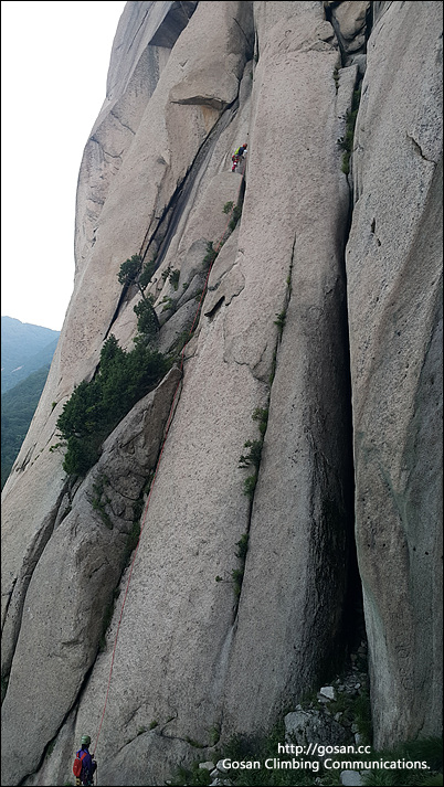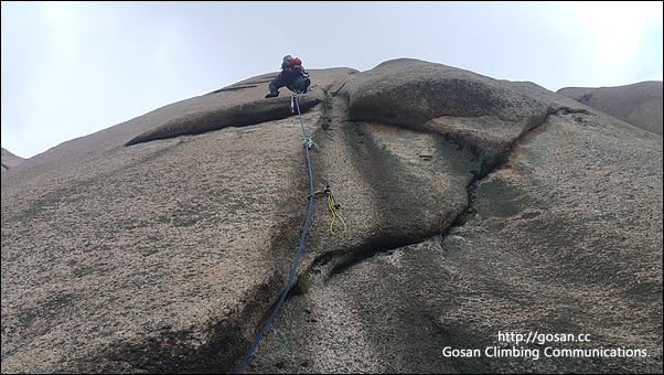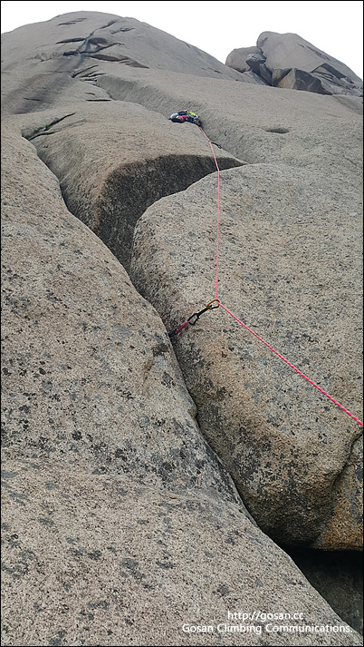 이 등반라인은 크랙 안으로 들어가기 보다는 레이백 형식으로 오르는 것이 더 쉽다.그러나 선등자는 추락에 공포가 있기 때문에 많이 부담스러울수 있다. 그래서 일까 우리 선등자는 이곳에 캐머롯 6호를 얼마나 깊이 박아 놓고 텐션을 받았는는지 결국 회수가 안되어 장비 개시하자마자 여기에 헌납하고 말았다.이걸 회수 할려면 석수쟁이들이 쓰는 끌과 망치로 바위를 쪼개고 갈아내서 회수 해야 한다. 이곳에서 회수 할려고 거의 30여분을 실갱이를 했지만 결국 포기 시간이 많이 지체되는 결과를 낳고 말았다.