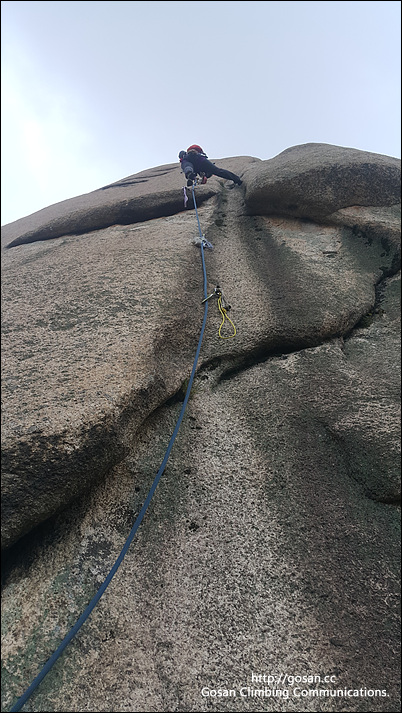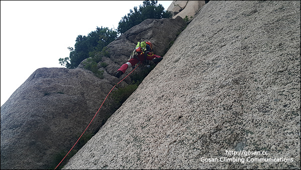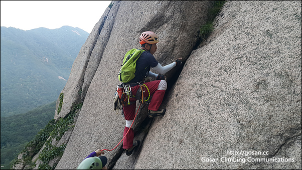 마지막 확보물에 넘어서기 위해서는 약간의 손가락이 살짝 걸리는 홀드를 잡아 넘어서야 하는데 밑에 캠이 하나 설치되어 있다고는 하지만 상당히 어렵다.아마도 정상적인 루트가 아니여서 그런지 이런루트로는 등반을 하지 않기를 권장한다.